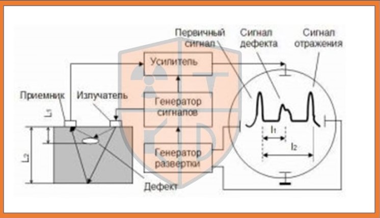 Метод основан на способности ультразвуковых волн проникать в материал на глубину и отражаться при наличии дефектных мест. Напомним, что ультразвуковыми колебаниями называют механические колебания упругой среды, частота которых более 20 кГц, т.е. находится за порогом слышимости человеческого уха. Для УЗК применяют колебания частотой 0,5 ÷ 10 МГц. Приемники и излучатели ультразвуковых колебаний называются пьезопреобразователями. Пучок ультразвуковых колебаний от пьезокристалла (вибрирующей пластинки) вводится в шов, который необходимо проконтролировать. При наличии дефекта ультразвуковая волна отражается он него и улавливается другой пластиной. Ее основное назначение — преобразовать колебания в электрический сигнал. После его усиления колебания подаются на дисплей дефектоскопа. Возникают импульсы разной высоты и ширины. Это свидетельствует о наличии дефекта. По виду импульсов судят о глубине залегания и длине дефекта. Пьезокристалл находится в специальном щупе. Дефектоскопист перемещают его по шву соединения по волнообразной линии и, таким образом, обследует сварной шов.
